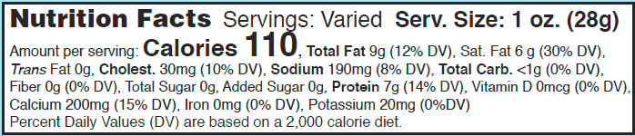 Ingredients: Pasteurized milk, Cultures, Salt, Enzymes, Annatto color